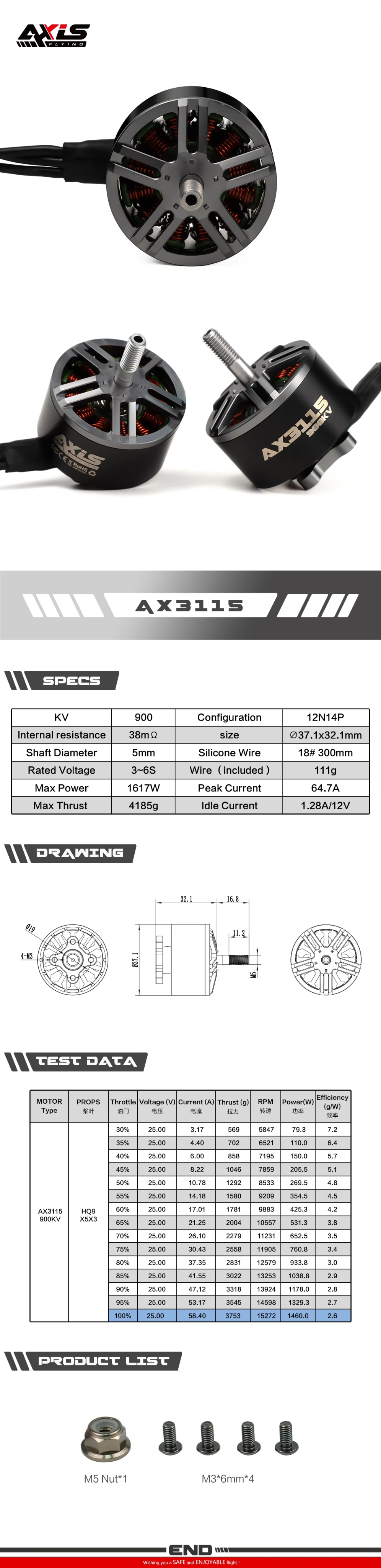 Мотор 900KV Axisflying забезпечує потужну роботу, ідеально підходить для довгих польотів з важкими навантаженнями на FPV-дронах.