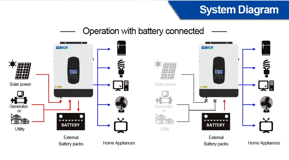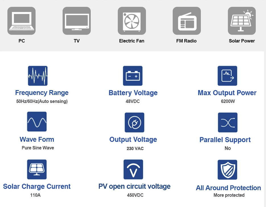 Це багатофункціональний інвертор/зарядний пристрій потужністю 6,2 KW, який поєднує в собі функції інвертора, сонячного зарядного пристрою MPPT і зарядного пристрою для акумулятора, щоб забезпечити підтримку безперебійного живлення з портативним розміром. Його повний РК-дисплей пропонує настроювані користувачем і легкодоступні кнопки, такі як струм зарядки акумулятора, . Пріоритет зарядного пристрою змінного струму/сонячної енергії, напруга заряджання/відключення батареї, прийнятна вхідна напруга на основі різних програм тощо.