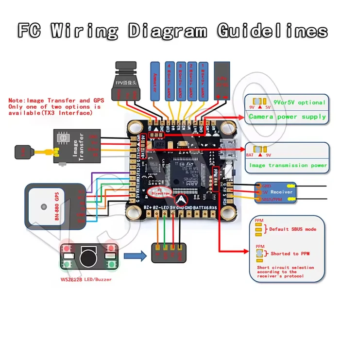 | Приймач: | Sbus, crsf, ibus, SBUS, XBUS receiver, The default receiver input is UART2(You can solder ELRS RX on UART6). |