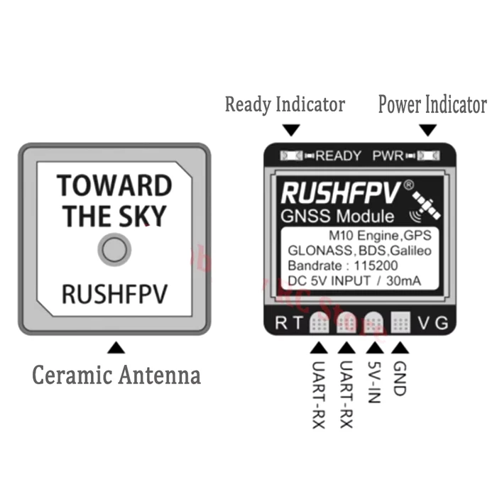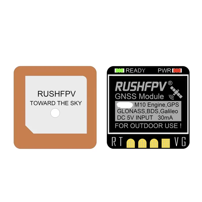 RUSHFPV GNSS MINI M10 UBX NMEA – GPS-модуль із вбудованою керамічною антеною, призначений для FPV-дронів і RC-літаків, що виконують польоти на далекі дистанції.